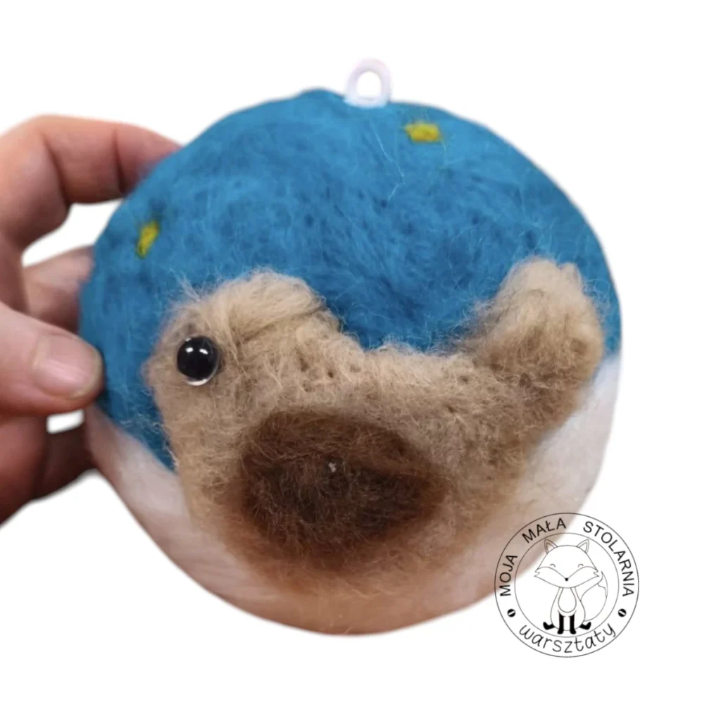 - Materiały: wełna czesankowa, baza w kształcie kuli lub gwiazdki oraz igły i gąbki do filcowania.